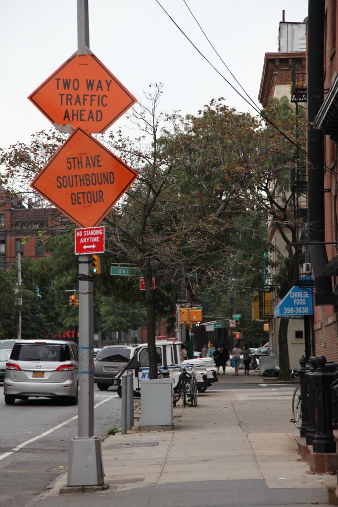 The widening of 6th Avenue to four lanes compensated for the loss of travel lane capacity created with the closing of 5th Avenue. That step is included in the first, or Project Descriptions Chapter (FEIS 1-24) describing the elements which define the project. It was apparently assumed to be in place at the time of the arena opening. In order to create room for the additional lanes 6th Avenue was to be widened 6 feet by removing sidewalk width. One impact of this change is that the southbound lanes on 5th and 6th Avenues that existed prior to the project's street closures are now doubled up into one travel lane. Of course now a traffic-generating arena will be added to the mix. To the right is a recent photo of a detour sign for southbound drivers on 6th Avenue.