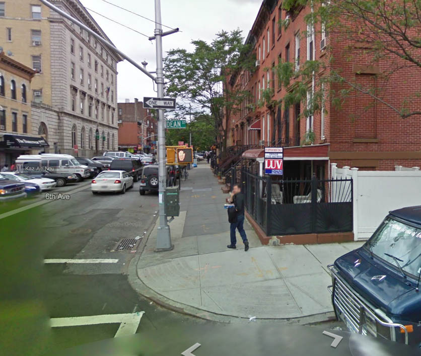 Second, the effective widths of the sidewalks on 6th Avenue, especially those south of Dean Street, were significantly overstated in the FEIS, meaning that if narrowed as originally anticipated they would have had marginal effective widths. The photo to the right is a Google Map Street View of the western 6th Avenue sidewalk looking up from Dean Street south toward Bergen Street.